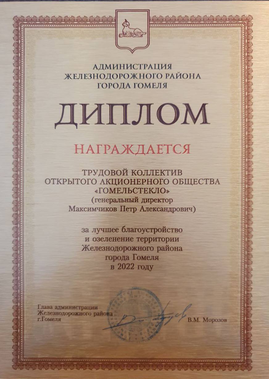 Диплом «Лучший трудовой коллектив» среди промышленный предприятий Железнодорожного района г. Гомеля с численностью выше 500 человек.