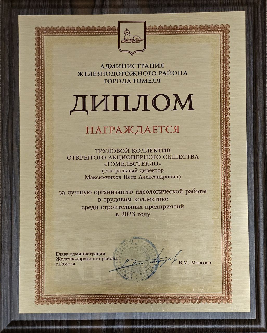 Диплом "За лучшую организацию идеологической работы в трудовом коллективе среди строительных предприятий в 2023 году"