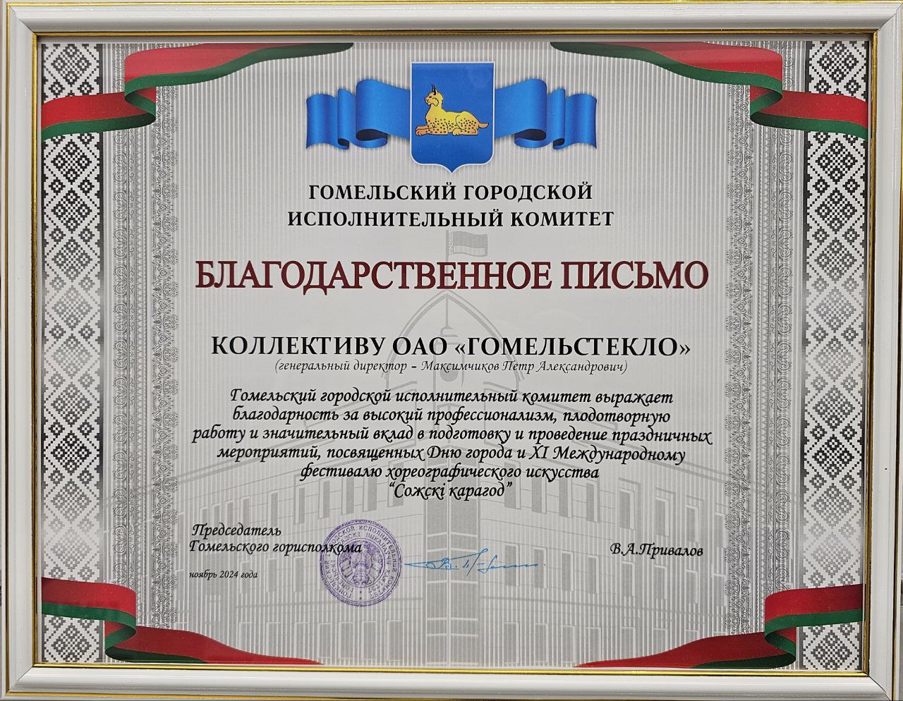 Благодарственное письмо коллективу ОАО "Гомельстекло" за высокий профессионализм, плодотворную работу и значительный вклад в подготовку и проведение праздничных мероприятий