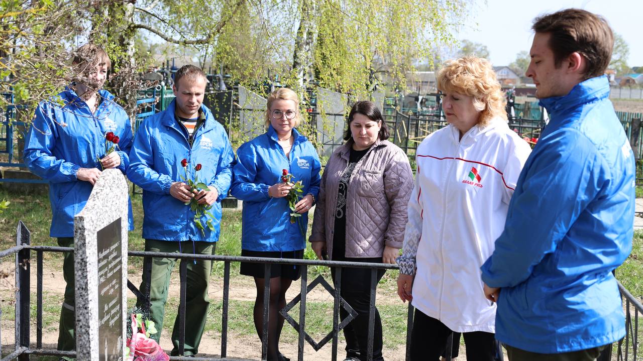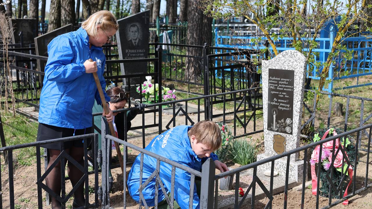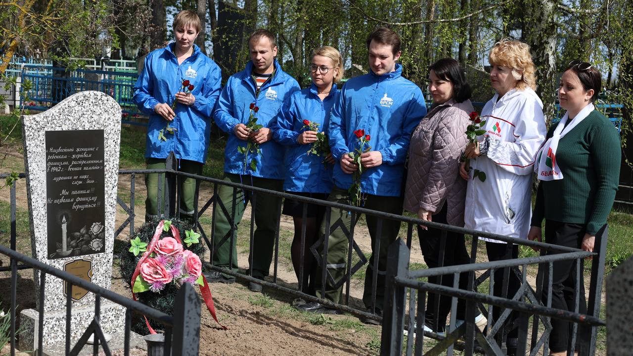 В рамках патриотической акции "100 дней до освобождения Беларуси", посвященной 80-летию освобождения Беларуси от немецко-фашистских захватчиков активисты общественных объединений Белая Русь и БРСМ посетили захоронение на кладбище в рабочем посёлке Большевик - памятник неизвестной женщине с ребёнком - жертвам фашизма, расстрелянным в 1942 году.