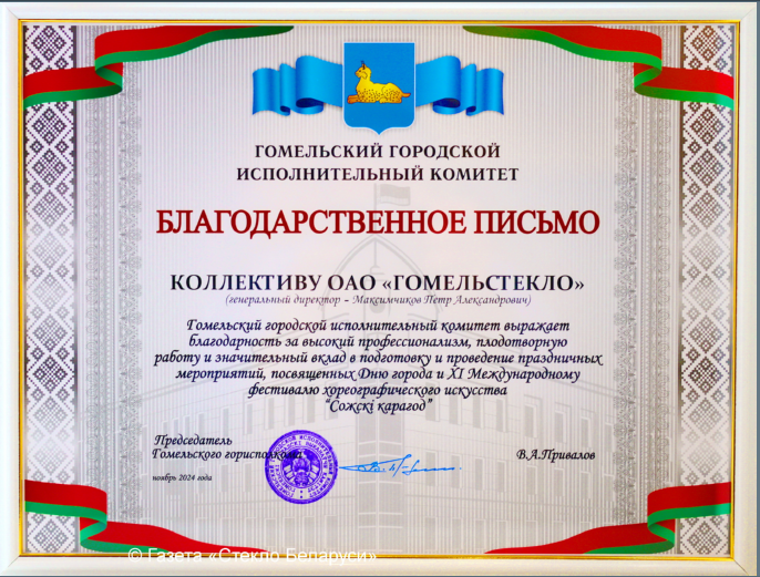 Коллектив ОАО «Гомельстекло» (генеральный директор – Максимчиков Петр Александрович) отмечен Благодарственным письмом Гомельского городского исполнительного комитета.